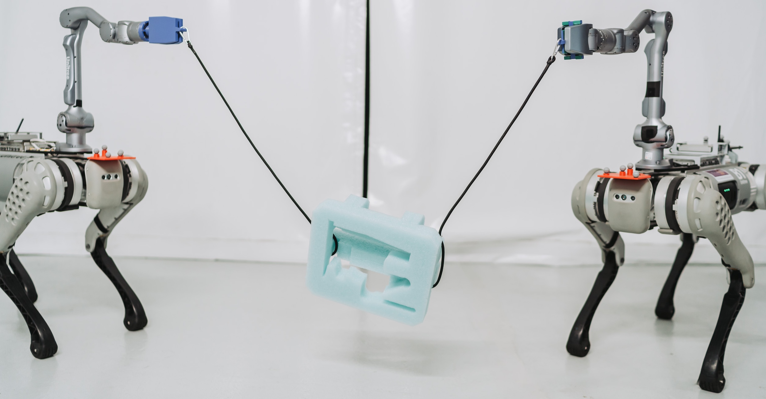The system lets users set an instruction, such as drawing a path for the bulky item to be transported along. The quadrupeds then ‘talk’ to each other to work out how to move their legs and manipulators to support the object’s path – imagine two humans moving a table up a flight of stairs, constantly readjusting their position and grip. This is possible thanks to a complex mix of mathematical models for robot control and spatial awareness.